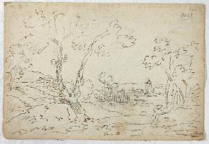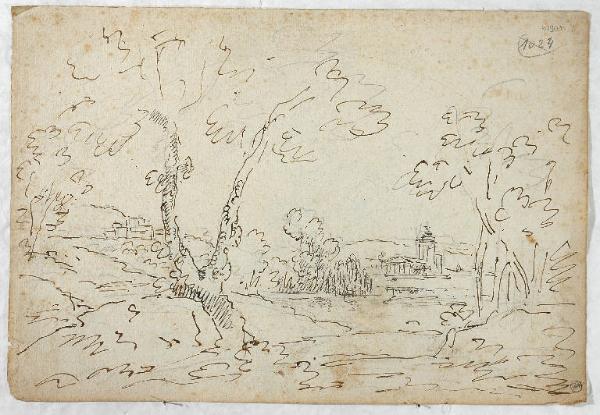 Scena raffigurante un paesaggio con chiesa sul fondo. PAESAGGIO