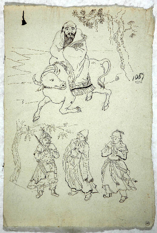 - NOTIZIE STORICO CRITICHE Per il soggetto trattato (di cui si veda alla scheda n. 00622411) questo disegno è probabilmente da ascrivere a Giuseppe Morgari, il quale, dopo aver studiato a Torino con il Pecheux, si dedicò a temi vari, comparve nel 1842 alla prima esposizione della Società Promotrice di Belle Arti di Torino e, per la sua abilità di prospettico e decoratore, venne nominato scenografo di corte dal sovrano Carlo Felice; tale incarico venne mantenuto in seguito anche con il re Carlo Alberto. Fu quindi incaricato della direzione della Reale Fabbrica di arazzi del Castello Valentino. La definizione piuttosto precisa dei costumi dei personaggi che compare in questo accurato bozzetto si deve probabilmente alla circolazione dei repertori decorativi giapponesi particolarmente diffusa a partire dagli anni Quaranta dell'800, grazie all'apertura delle frontiere ed allo sviluppo conseguente degli scambi commerciali con il Giappone, fino ad allora chiuso nei confronti degli altri paesi. Non paiono invece esserci evidenti analogie con la decorazione della sala cinese di Palazzo Madama, ove Morgari fu impegnato per l'ornamentazione della volta dello scalone dell'edificio. La mancanza di annotazioni specifiche riguardo ai personaggi non sembra far pensare comunque a costumi di scena da teatro, quali quelli, assai meno caratterizzati, che venivano realizzati per alcuni balli, a partire dal ballo di Angiolini, "L'Orphelin de la Chine" (L'Orfano della Cina) del 1790, o il replicatissimo Gengiskan di Monticini dato al Regio di Torino dal 1805.