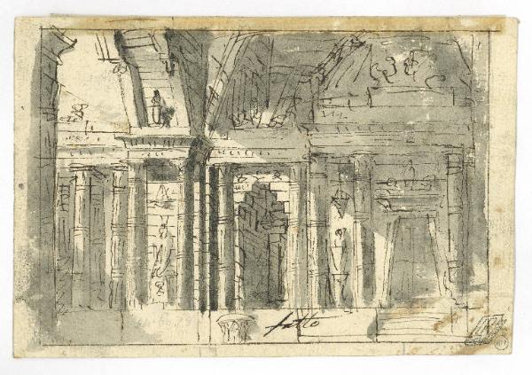 - NOTIZIE STORICO CRITICHE Il disegno può essere accostato alle scenografie dei Galliari per il modo di articolare prospetticamente lo spazio, come pure per il gusto estroso degli ornamenti che decorano l'ambiente.