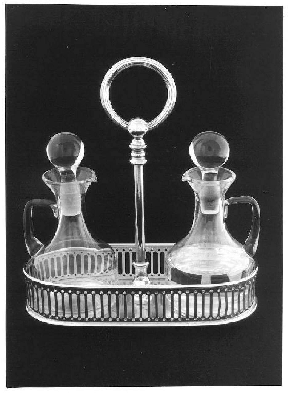 Vassoio ovale con ringhierina a trafori ovali regolari, montante centrale liscio con base a balaustro, presa ad anello scanalato, ampolline in vetro