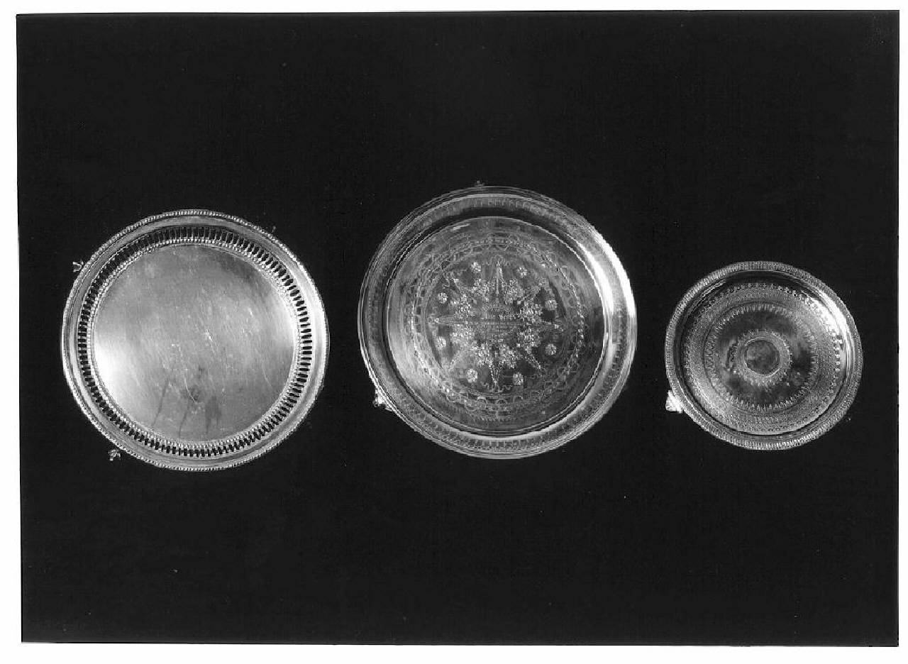 Corpo circolare con tre piedini piatti con decorazioni geometriche, al centro decorazioni incise con motivi circolari concentrici e decorazioni geometriche, a onde, a festoni e a palmette