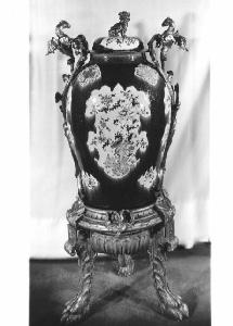 Vaso montato in bronzo dorato con manici a draghi, presa a leone, base indipendente con decorazione a nastri e terminante in zampe leonine