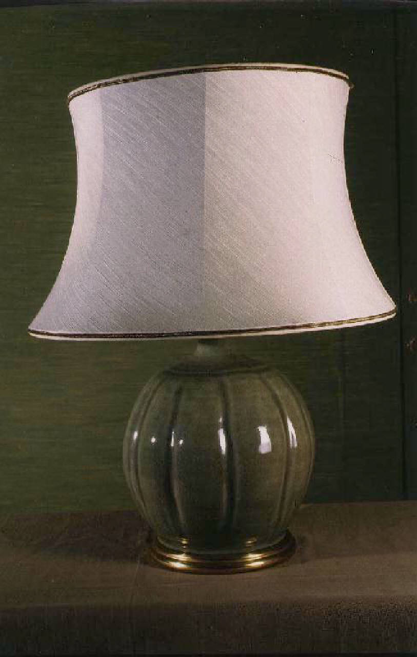 Vaso bombato baccellato verde con montatura alla base in legno dorato, paralume in stoffa beige