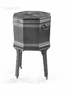 Corpo ottagonale con coperchio incernierato, profili e maniglie laterali in ottone; base tripode in legno con supporti a pilastrini scanalati