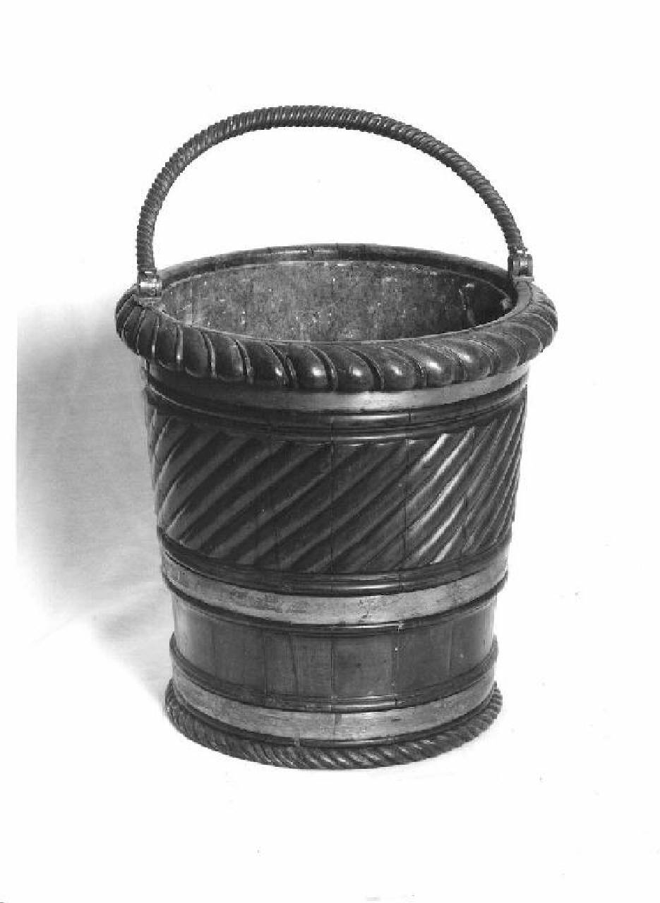 Corpo cilindrico svasato con scanalatura centrale a spirale, bordi superiore e inferiore a tortiglione, tre bande orizzontali lisce in ottone