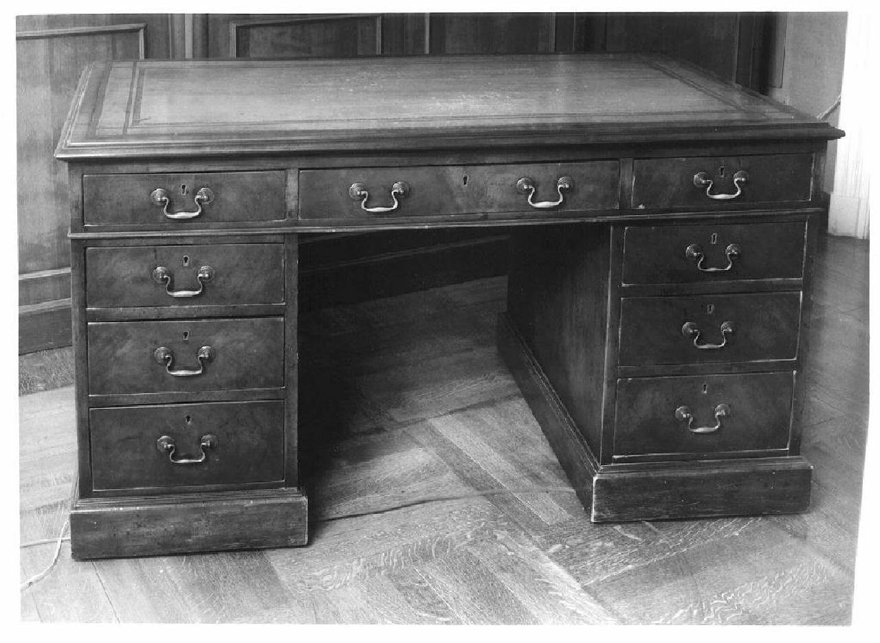 Scrivania con due larghi supporti laterali su zoccolo, ogununo a quattro cassetti, tre cassetti lungo la fascia superiore; piano rivestito in pelle