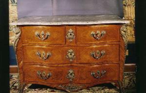 Cassettone con fronte a serpentina, piano in marmo, due cassetti lunghi e due corti superiori, applicazioni angolari, scarpette e maniglie in bronzo dorato a volute, grembiale sagomato, piedi a ricciolo, impiallacciatura a farfalla