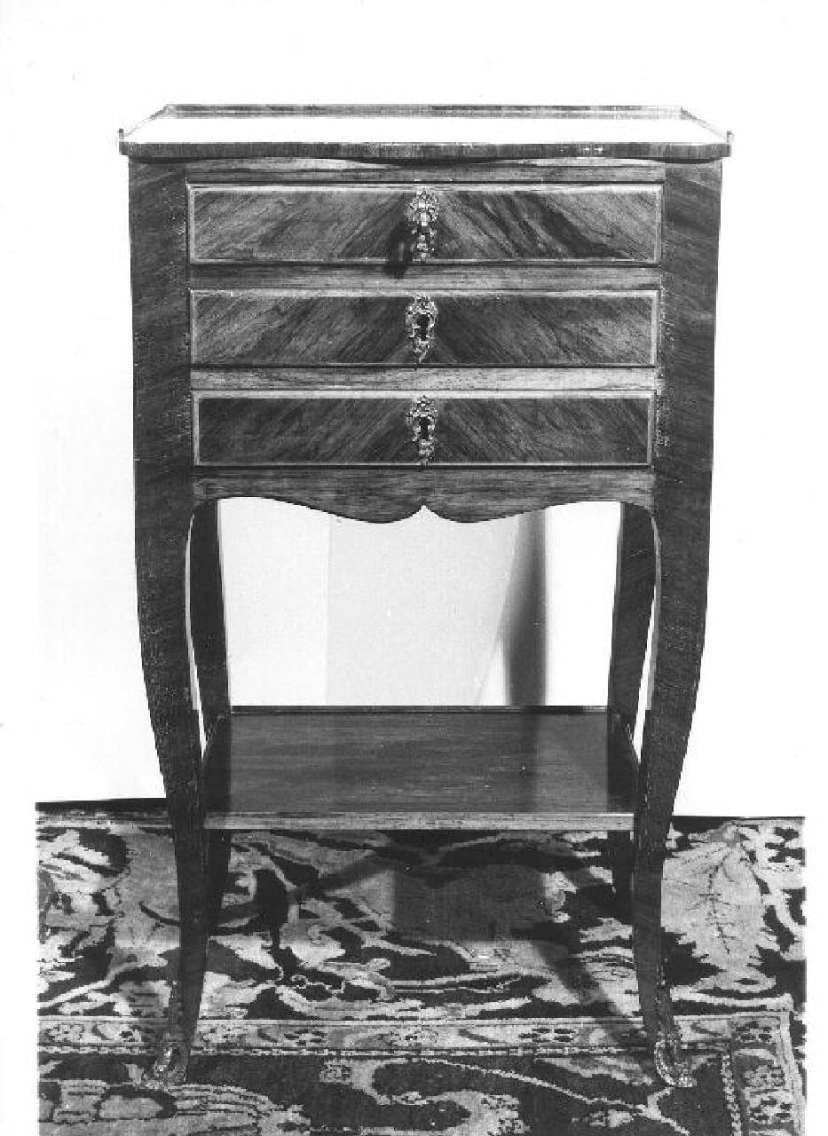 Tavolino a tre cassetti e ripiano inferiore, piano superiore sagomato anteriormente, grembiale sagomato, gambe mosse con scarpette a ricciolo