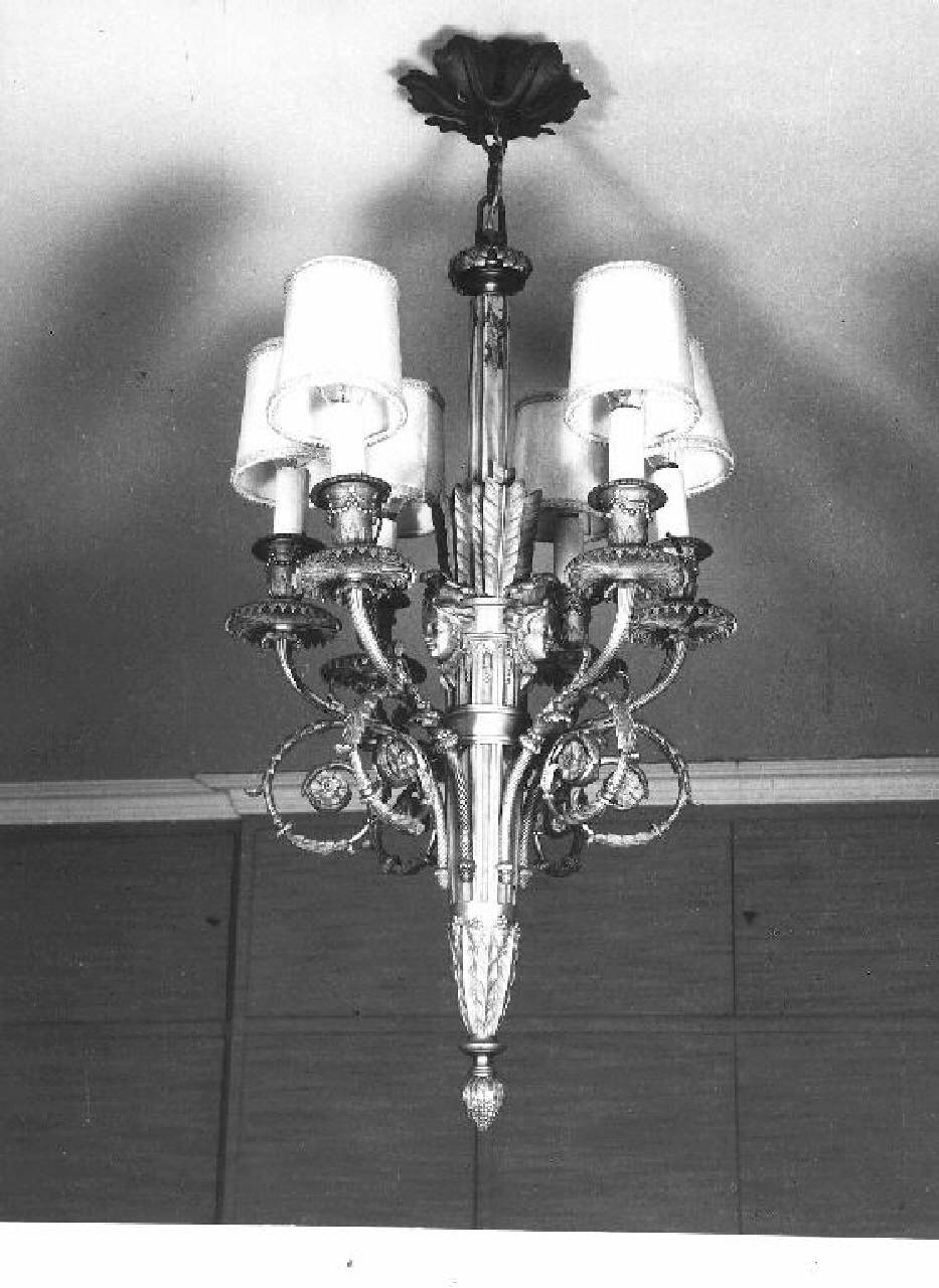 Lampadario a sei bracci a volute con fusto a faretra scanalata con frecce, decorato con maschere femminili