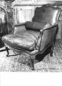 Poltrona rivestita in pelle marrone; braccioli imbottiti, schienale arretrato e sagomato, decori a intagli con motivi a foglia e fiori, gambe e braccioli mossi, cuscino della seduta e cuscino tubolare indipendenti