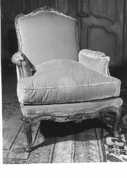 Poltrona rivestita in velluto rosa, braccioli imbottiti, struttura lignea dipinta in marrone e verdino, sagomata, intagliata e centrata da motivo fiori e nastri, gambe e braccioli mossi, schienale arretrato, cuscino indipendente