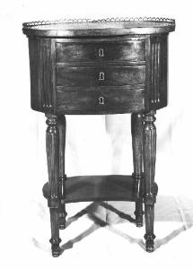 Tavolino a corpo ovale con tre cassetti e scanalatire laterali, piano superiore in marmo con ringhierina traforata, traversa ovale, gambe a balaustro scanalate