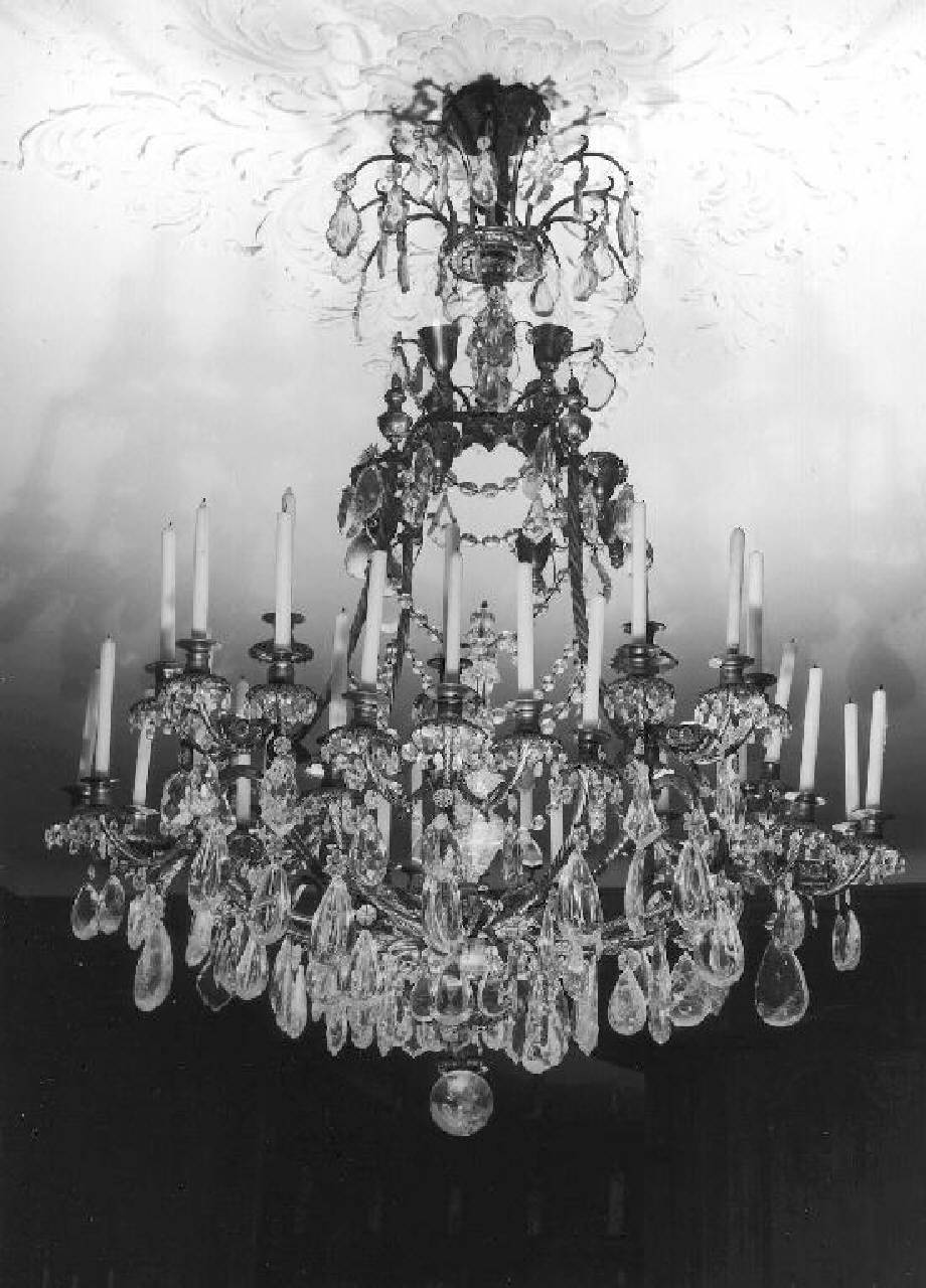 Lampadario campaniforme a otto bracci di quattro luci ciascuno alternati a otto bracci a luce singola; sostegni tortili, cristalli geometrici sul fusto centrale, pendenti