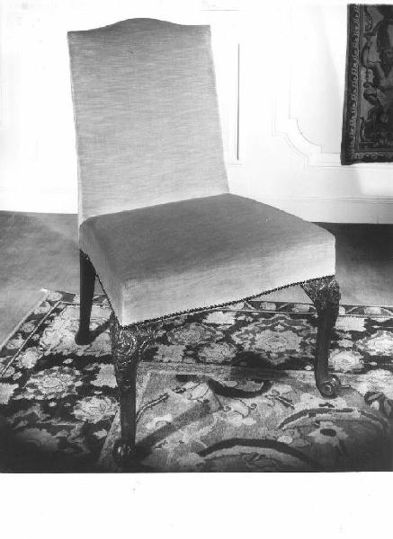 Schienale sagomato superiormente e imbottito e rifinito a borchie come la seduta; gambe mosse con piedi a ricciolo e decorazioni a fogliami