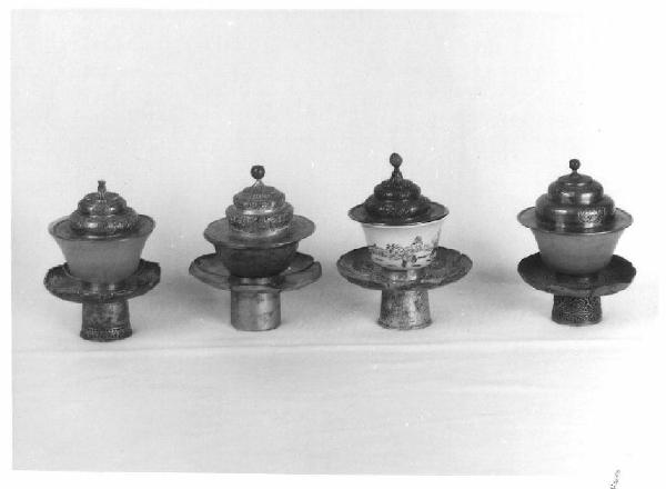 Composto da tre parti, un sotto tazza in argento sbalzato, la tazza in vetro e il coperchio in argento. Sulla punta del coperchio c'è una pallina decorativa in pietra rossa.