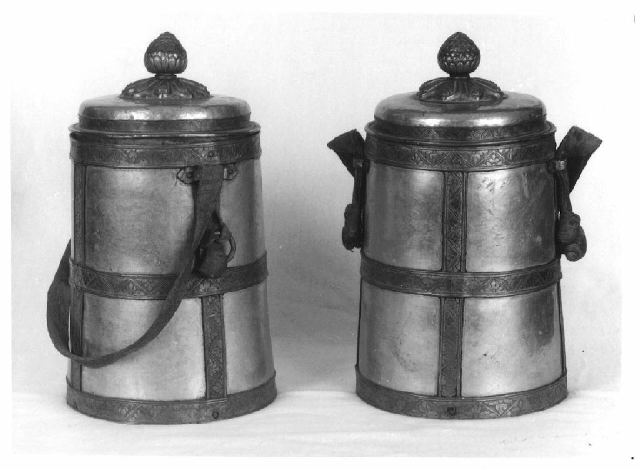 Secchiello per viveri in argento con decorazioni a sbalzo su altro metallo. Maniglia in pelle. Sul coperchio decorazioni a sbalzo con una pigna in cima.