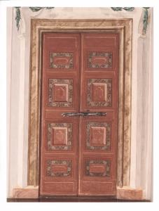 - NOTIZIE STORICO CRITICHE La porta è divisa in due battenti con quattro riquadri, rialzati, per ciascuno. La decorazione, che si imposta su una superficie dipinta di rosa, presenta una serto di fiori bianchi, e foglie che circondano la parte centrale, caratterizzandosi, anche in questo caso, come elemento omogeno all'interno dell'intera decorazione della prima sala. Il decoro della porta venne eseguito stendendo il colore a tempera direttamente sulla superficie lignea, senza alcuna preparazione. L'effetto ottenuto era perciò volutamente discreto e non copriva le sottostanti venature del legno.