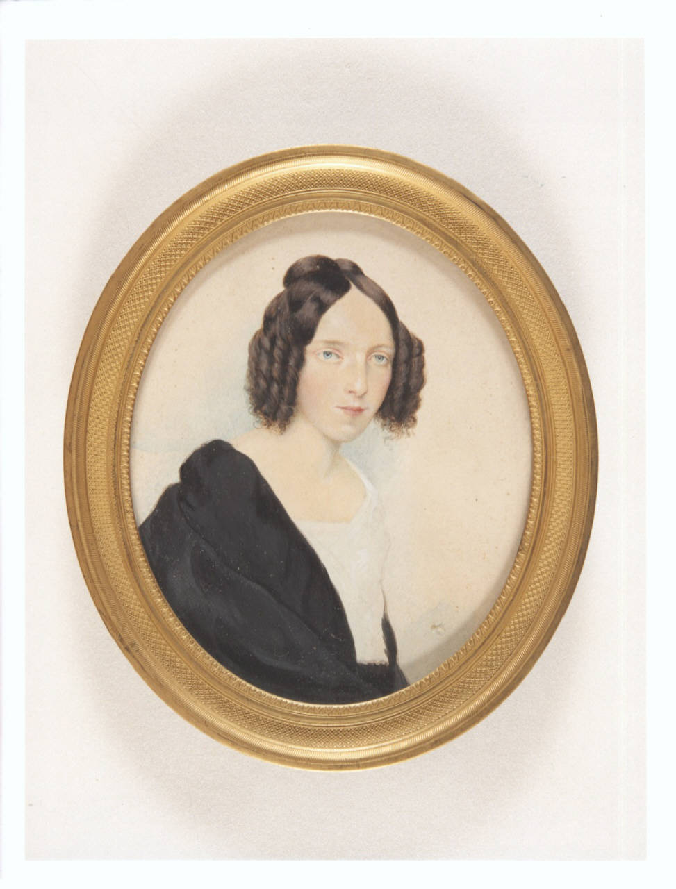La piccola miniatura raffigura una fanciulla il cui pallido volto, ravvivato da un delicato colorito rosa delle guance, è messo ulteriormente in risalto dal bianco dei pizzi e dal nero del mantello che l'avvolge.\nCornice ovale in bronzo dorato.