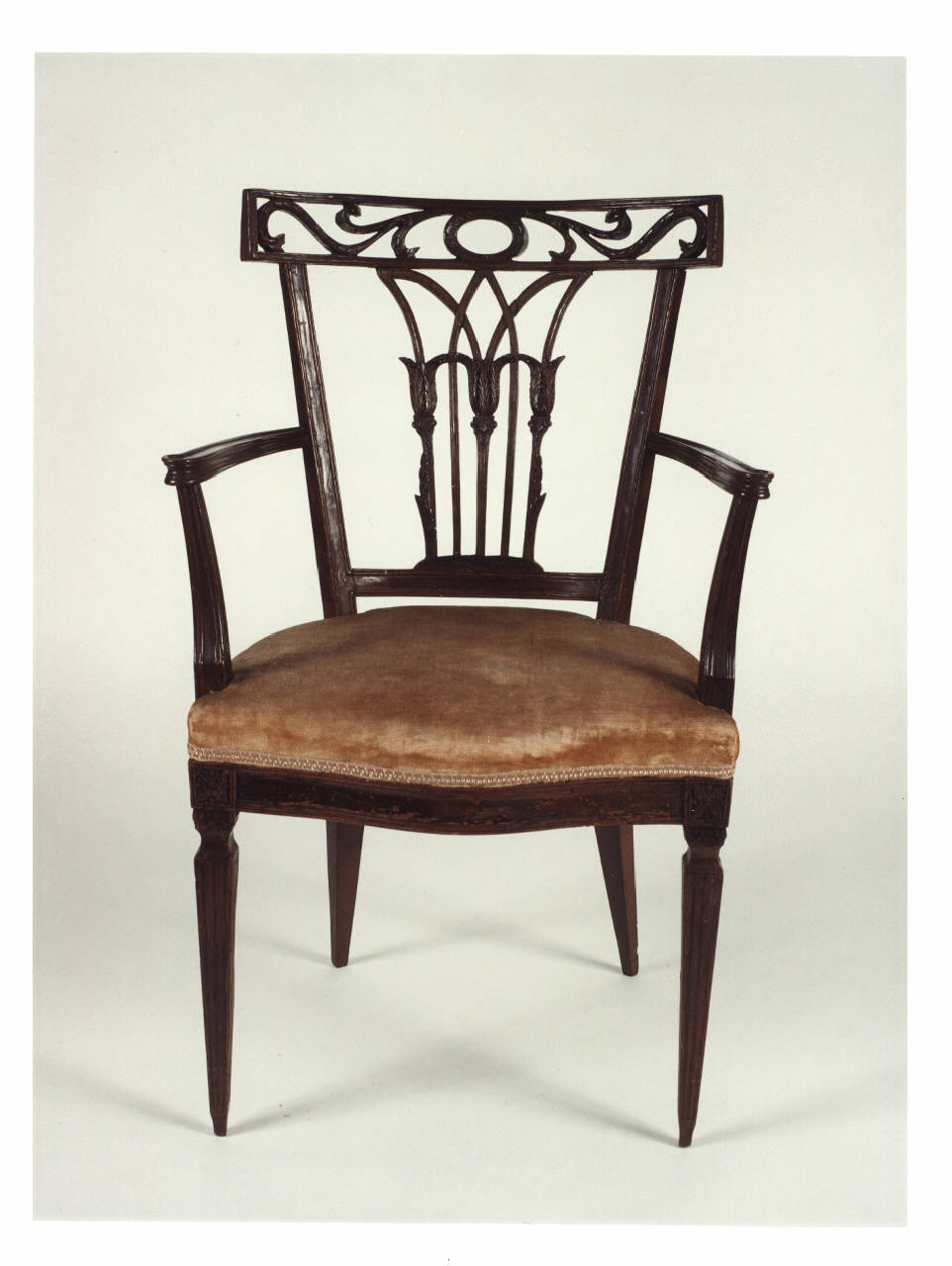 Poltrona con seduta in velluto rosa.\nLe due poltrone hanno lo schienale intagliato con motivi floreali, tre tulipani, e ovale con due tralci laterali nella parte superiore. I braccioli sono leggermente arcuati, come la profilatura della poltrona. I sostegni diritti, quelli anteriori a spillo, rastremati verso il basso e leggermente scanalati.