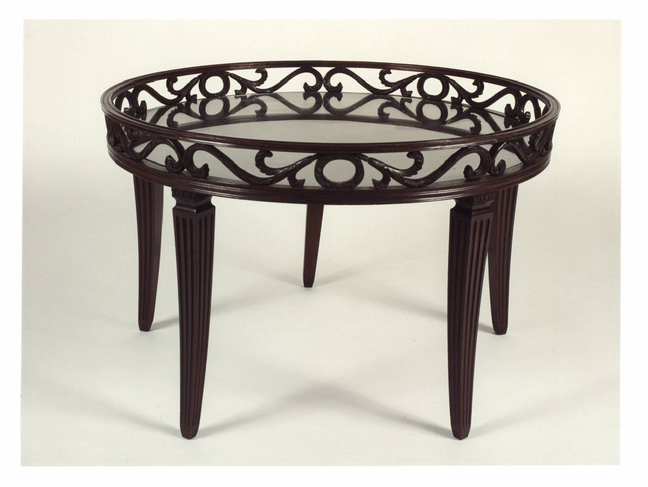 Tavolino basso, rotondo, in stile Luigi XVI.\nPresenta un piano in cristallo con decoro a volute e ovale centrale. Cinque i sostegni, leggermente arcuati, con scanalature, rastremati verso il basso.