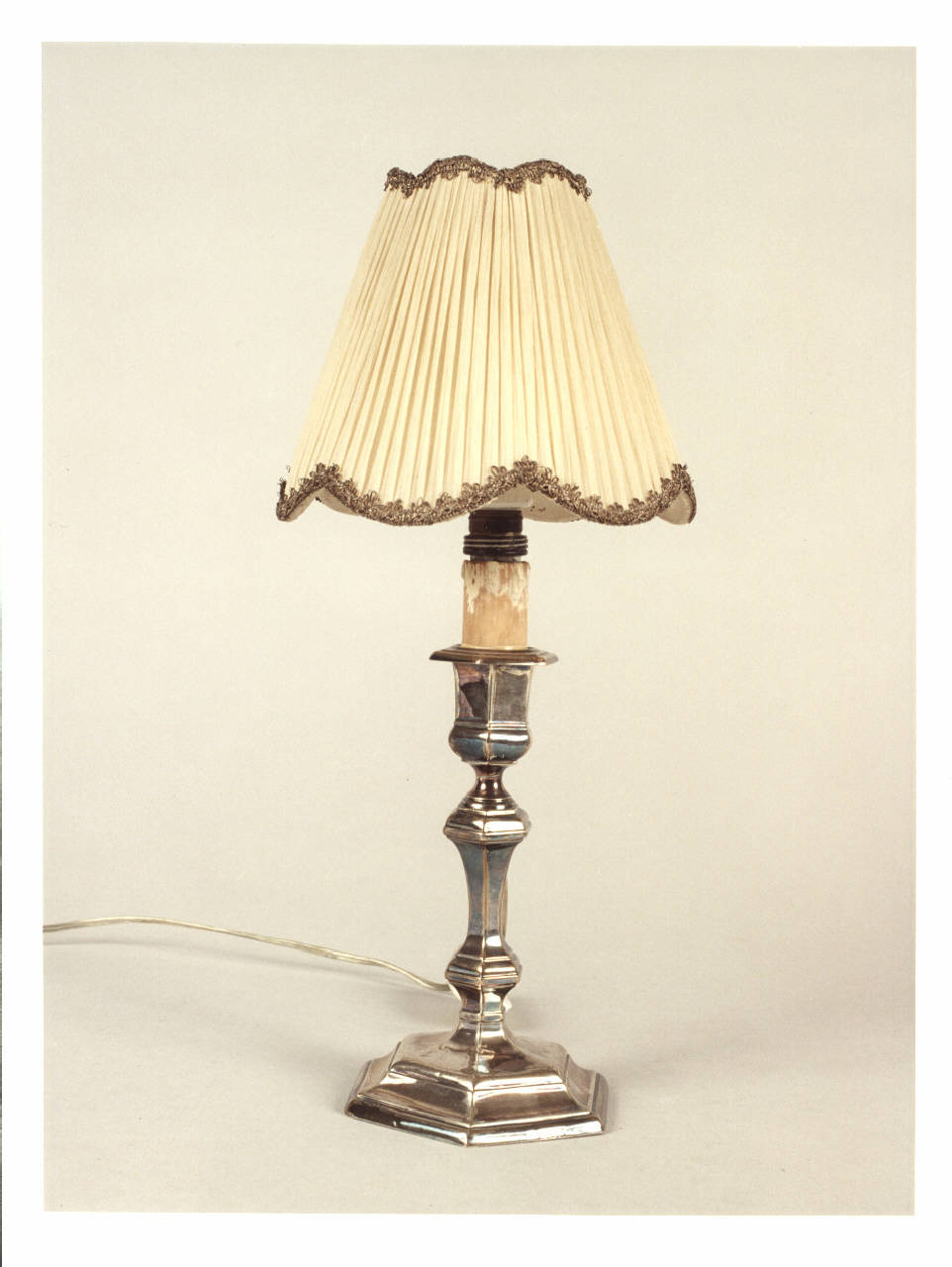 Piccolo candeliere in argento, di buona fattura, adattato ad elettricità. Paralume in seta avorio plissettata con passamaneria dorata sia nella parte alta che bassa.