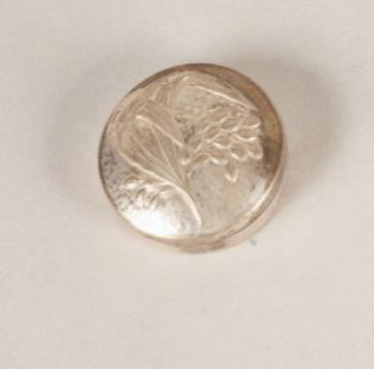 Portapillole in argento sbalzato moderno. Coperchio con delle foglie di granoturco.