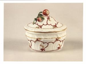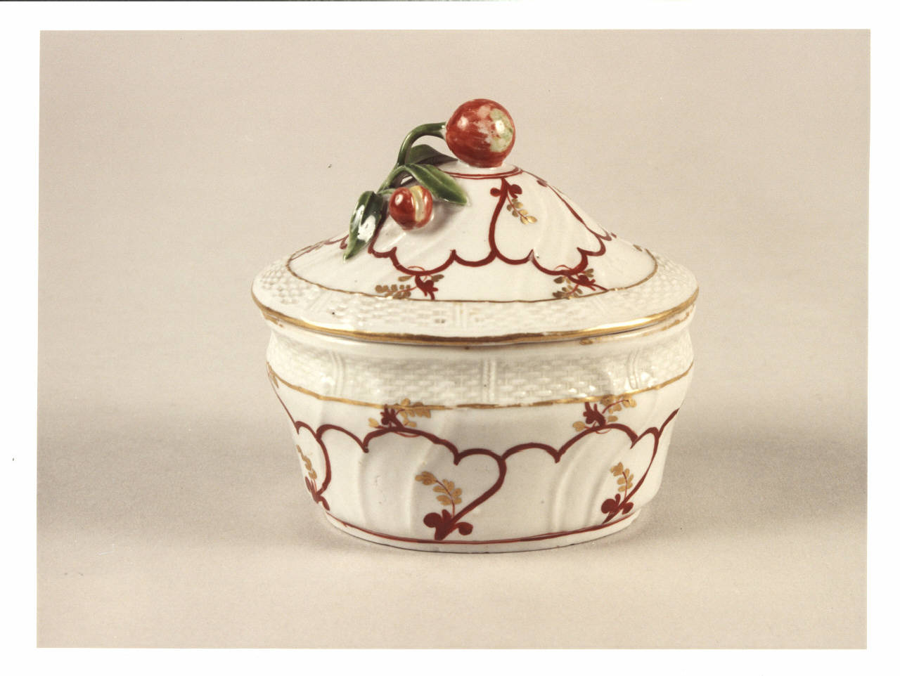 Zuccheriera con coperchio con pomolo a ciliegia, decorata in oro e rosso.