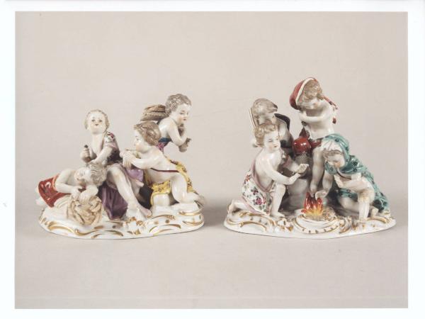 - NOTIZIE STORICO CRITICHE I due gruppi in porcellana raffigurano l'Estate con dei bambini che sorreggono delle spighe di grano, mentre l'Inverno è identificato come tale dal fuoco e dal caratteristico beretto rosso bordato di bianco che ricorda Santa Klaus. Le porcellane prodotte a Ludwigsburg, come il marchio identifica, hanno impasto leggermente grigiastro e si caratterizzano per composizioni con gruppi di figure, spesso associate al balletto.