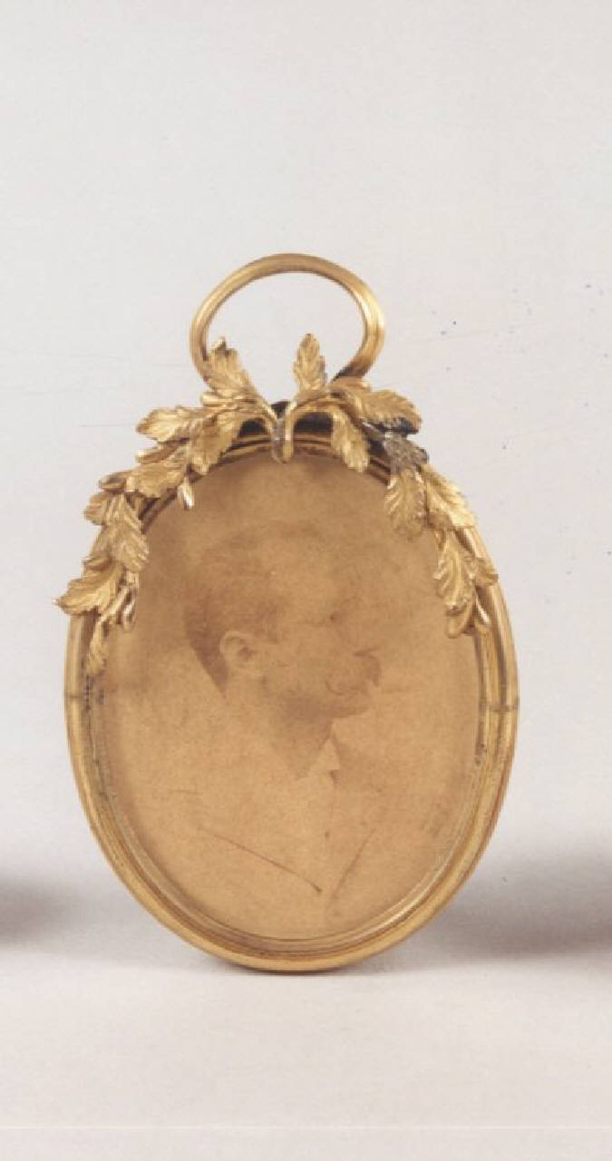 Cornice in bronzo dorato di forma ovale con decoro a foglie nella parte superiore.