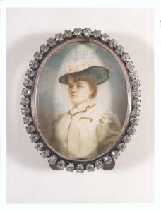 Cornice moderna in argento decorata con finti diamanti a taglio brillante.\nLa miniatura raffigura una giovane donna vista di tre quarti, il volto serio e lo sguardo lontano. Lo sfondo nei toni azzurri e marroni così come la definizione della figura è ottenuto attraverso l'uso di pastelli che rendono l'opera caratterizzata da una certa soffusità del colore, anche se la grana piuttosto grossa non permette di conferire quella sensazione vellutata tipica delle matite colorate.