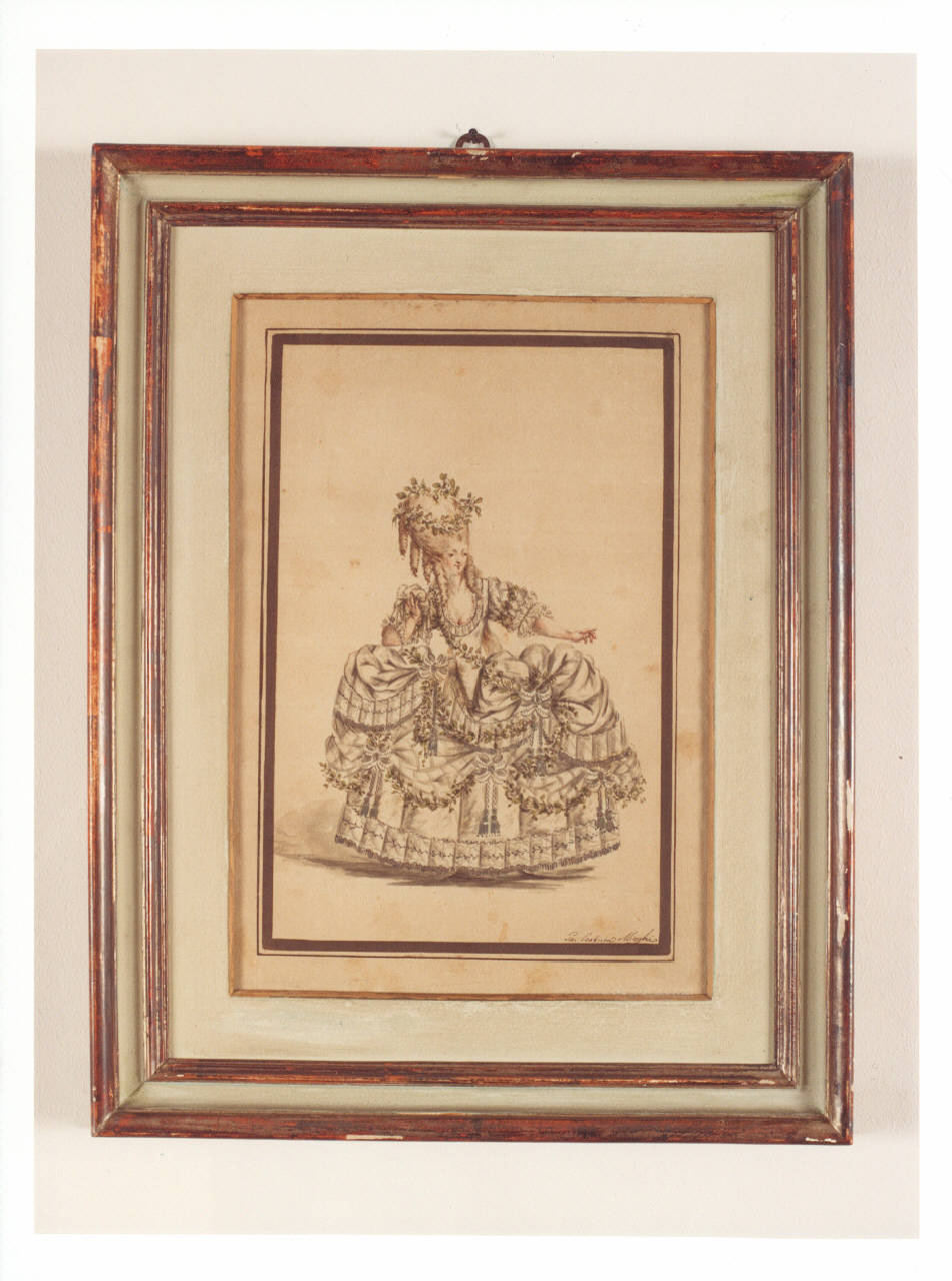 Acquerello racchiuso da una cornice in legno dorato e dipinto a doppia bordura.\nIl delicato acquerello raffigura una giovane donna con un prezioso abito da sera caratterizzato dalla presenza di una gabbia sottostante che allora serviva ad accentuare i fianchi, di contro ad un vitino sottilissimo ottenuto attraverso l'uso di bustini. Il ricco tessuto è ulteriormente impreziosito da nastri, pizzi, frange e da ghirlande di foglie e fiori, le stesse che si ritrovano anche nella acconciatura, qui formata da una parrucca a boccolo.
