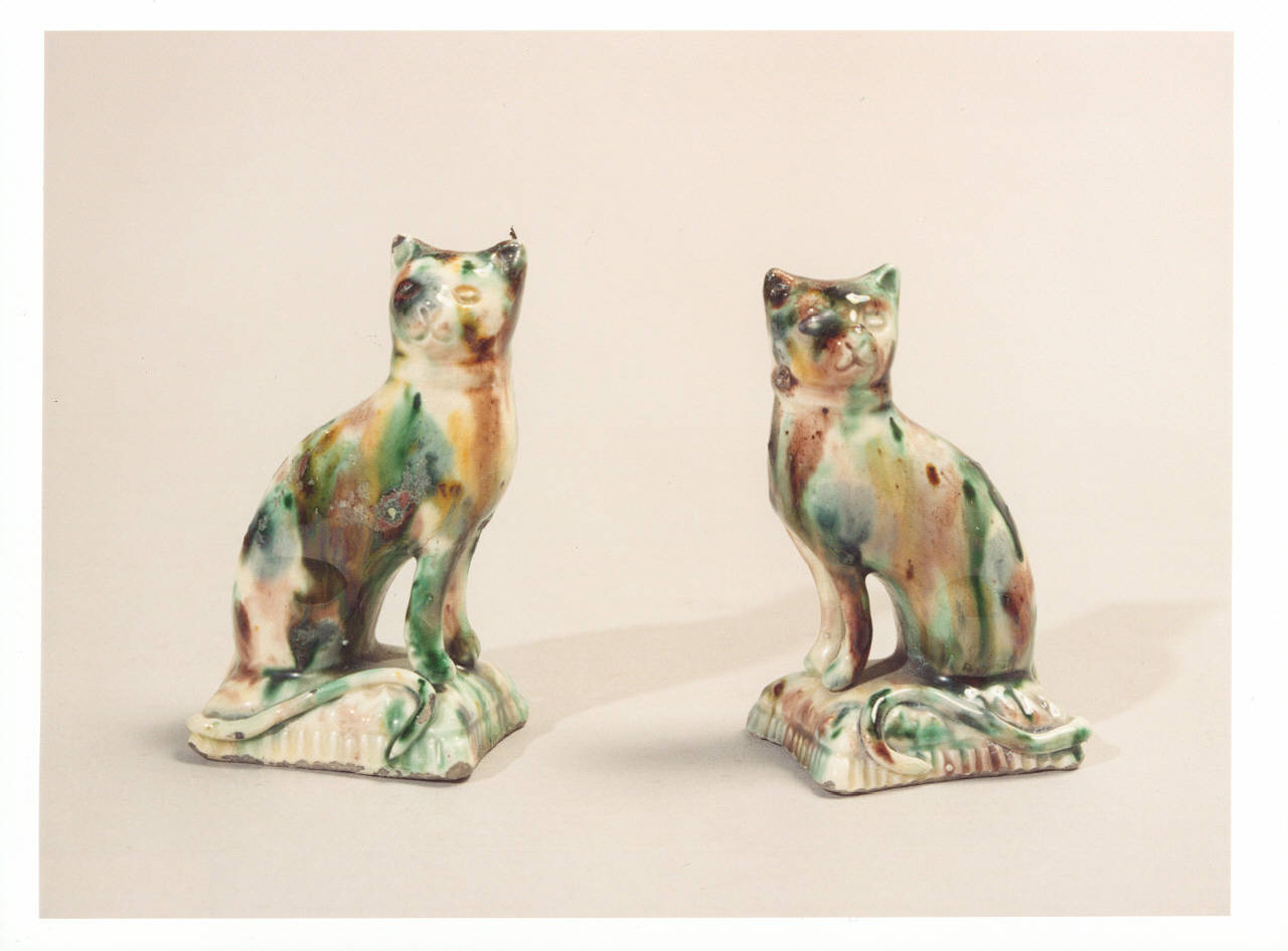 - NOTIZIE STORICO CRITICHE Due gatti in ceramica dipinta con la prevalenza, nei toni, del verde, giallo e ocra. Sono molto simili ad altri due identici soggetti, quindi si ipotizza che possano appartenere alla stessa manifattura inglese.