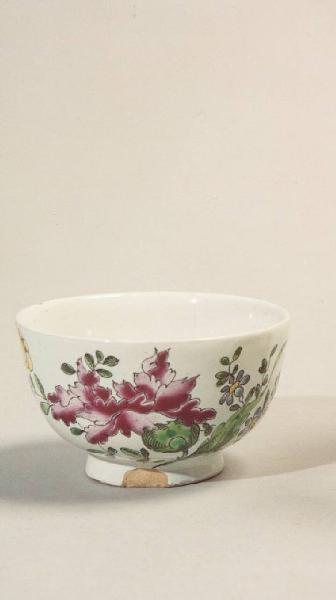 - NOTIZIE STORICO CRITICHE La tazzina rivela nell'uso dei colori una cottura a "piccolo fuoco" o a "muffola", cioè basata su tre fasi di cottura, dove l'ultima serviva per fissare i colori sullo smalto già consolidato attraverso basse temperature, circa 650°-700°. Questo permetteva di usare una gamma cromatica decisamente ampia, introducendo colori come il rosso facilmente alterabile alle alte temperature. La decorazione floreale è tipica della produzione lodigiana e si può presentare contornata, come nell'opera in oggetto, o senza contorno, quest'ultimo caratterizzante opere di alto livello artistico. Da un confronto con alcuni pezzi conservati presso il Museo Civico di Lodi, si deduce l'appartenenza alla produzione lodigiana di maioliche della fine del XVIII secolo con decoro "alla rosa".