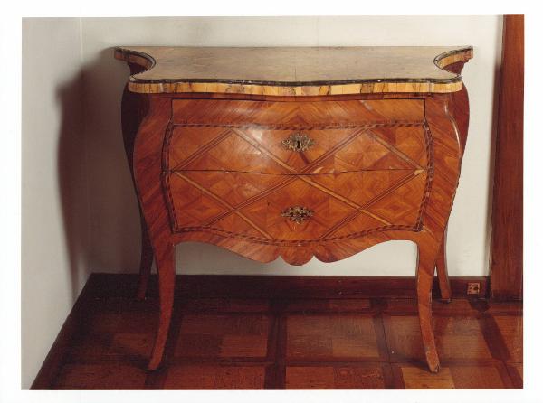 - NOTIZIE STORICO CRITICHE I due comò sono in stile Luigi XV, realizzati in un periodo compreso tra il 1722 e il 1760 e di manifattura romana. I mobili di questo periodo, di cui questi due manufatti ne costituiscono un buon esempio, si caratterizzano per linee curve e leggere, per fianchi ondulati, dimensioni ridotte; tra i motivi decorativi compaiono gli intarsi geometrici, spesso realizzati in bois de rose.