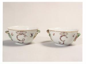 Tazze con manici laterali, bordo dorato, decoro floreale e monogramma centrale.
