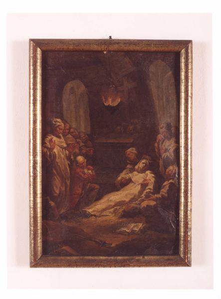 - NOTIZIE STORICO CRITICHE Il dipinto, già nella collezione delle sorelle Gigina e Nedda Necchi, entra a far parte del patrimonio FAI nel 2001, in quanto parte del lascito di Villa Necchi Campiglio a Milano. L'opera, di dubbia attribuzione, raffigura probabilmente la morte di San Benedetto, come sembrerebbe suggerire il saio bianco con il cappuccio. Il corpo del Santo è circondato da figure di monaci dolenti e da un'unica figura in abiti civili con le mani giunte, non identificabile. Risulta particolarmente tetra l'ambientazione, con un sarcofago sormontato da una grossa croce e dai teschi sullo sfondo a cui si contrappone la luce soffusa che piove sui personaggi dall'alto rendendo la composizione complessivamente meno tetra.