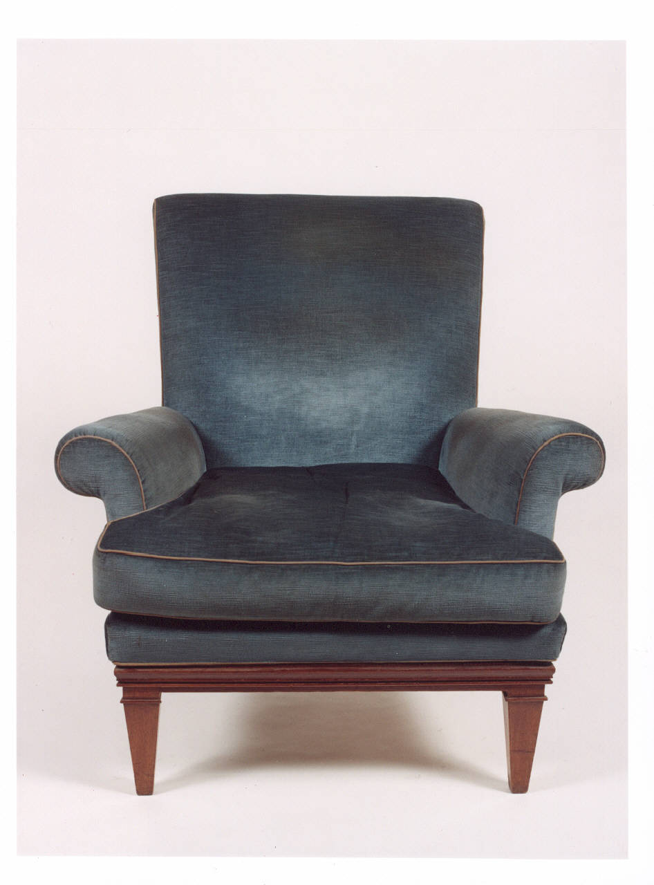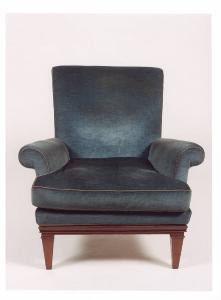 Poltrona rivestita di velluto; sostegni in legno, alto schienale e ampi braccioli.