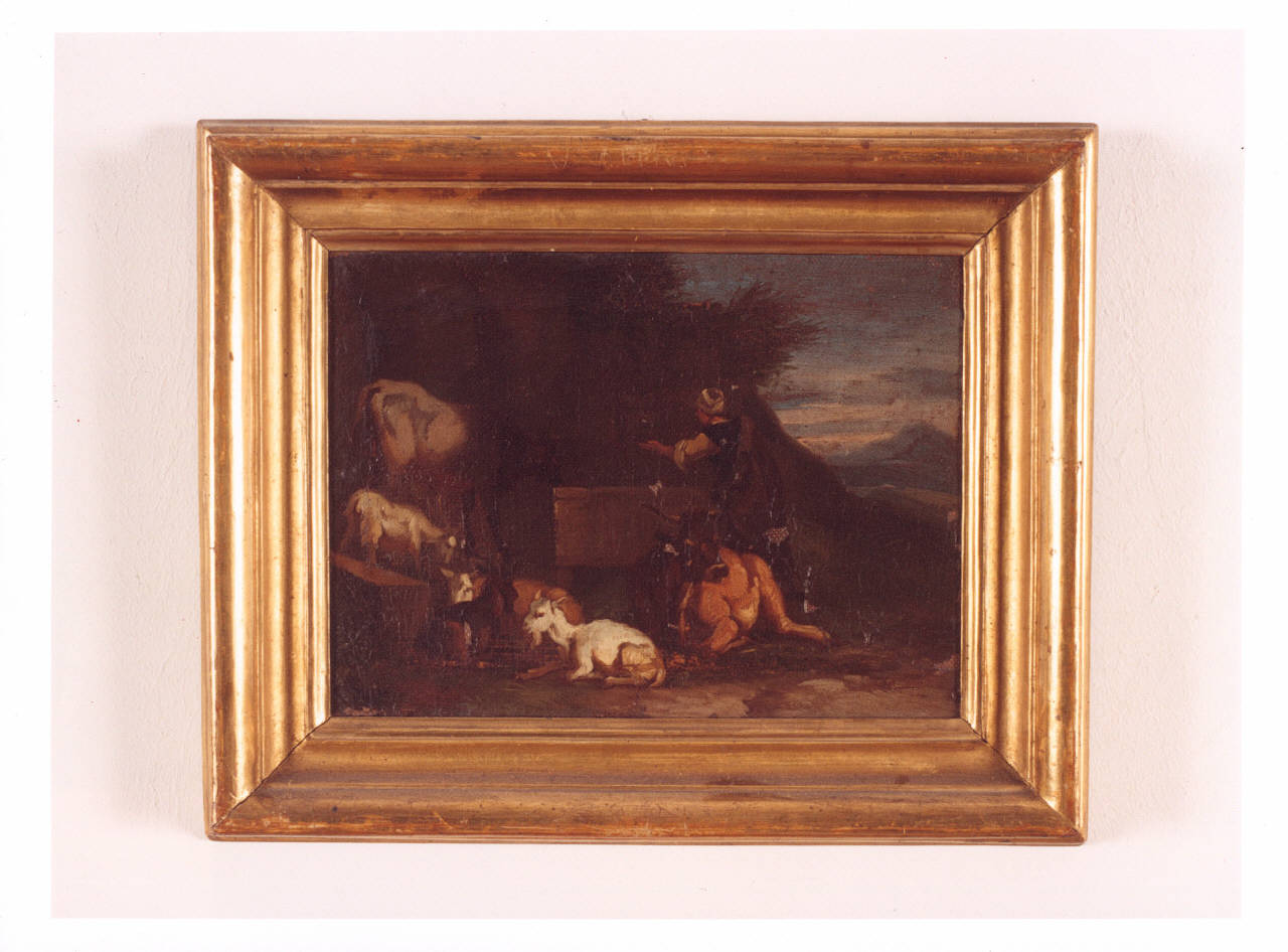 - NOTIZIE STORICO CRITICHE Il dipinto, già nella collezione delle sorelle Gigina e Nedda Necchi, entra a far parte del patrimonio FAI nel 2001, in quanto parte del lascito di Villa Necchi Campiglio a Milano. L'opera raffigura una scena di vita pastorale: in primo piano alcuni animali a riposo (capre e mucche) e dietro una figura ritratta di spalle. La gamma cromatica sui toni scuri e bruni è rischiarata da una luce proveniente dalla destra del dipinto che colpisce il corpo della mucca al centro della composizione e la capretta al suo fianco. L'opera è stata ricondotta alla Scuola Bambocciante, scuola romana del XVII secolo che seguendo l'artista Pieter van Laer (detto il Bamboccio) proponeva soggetti umili e scena di vita popolare, con un gusto realistico e effetti di luci e colore. Le piccolissime dimensioni del dipinto sembrano avvalorare l'ipotesi di un'attribuzione all'ambito bambocciante, al quale si riconducono numerose opere di piccolo formato.