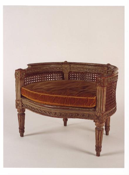 Poltroncina nana Luigi XVI in legno intagliato, dorato, laccato con copertura cannè.