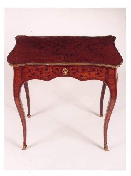 Tavolino scrittoio Luigi XV impiallacciato e intarsiato in bois de rose e bois de violette; montature in bronzo dorato e stampigliato, tavoletta e cassettino portapenne estraibile sul lato corto; cassetto sul lato lungo.