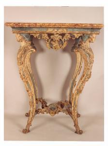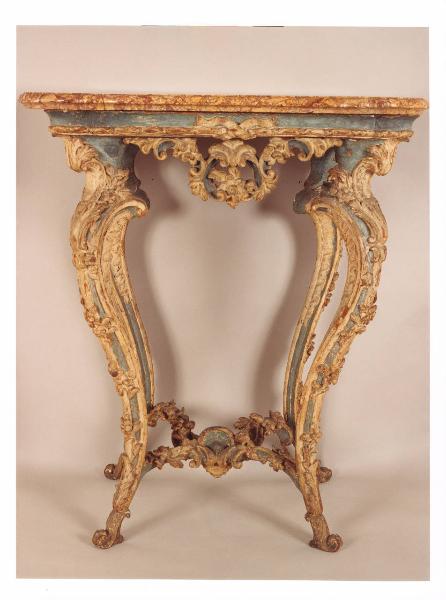 - NOTIZIE STORICO CRITICHE Importante console caratterizzata da un piano in marmo e da sostegni in legno dorato che mostrano un decoro riferibile al periodo Luigi XV, più che al momento della transizione, cioè quel lasso di tempo che va dal 1790 a l 1804, da Luigi XVI a Napoleone, in cui scompaiono alcuni elementi caratteristici del periodo precedente quali i sostegni a ricciolo, sostituiti da gambe a sciabola o a fuso.\nI mobili in precedenza si trovavano nel piano seminterrato di Villa Necchi.
