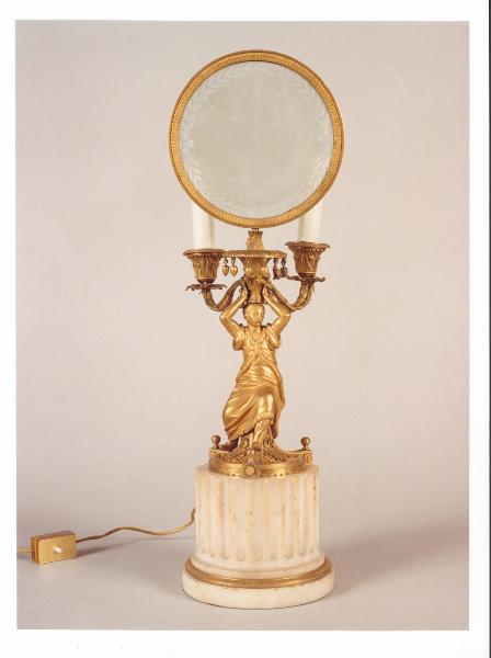 - NOTIZIE STORICO CRITICHE Del tutto particolare tanto la tipologia del candelabro con paralume, di cui il vetro probabilmente non pertinente, quanto quella del corpo costituito da una figura femminile chiaramente di ispirazione sinizzante, reggente i due bracci e il paralume. Il bel modellato della veste, del volto e della anatomia sottende il lavoro di un raffinato modellatore. Iconograficamente è del tutto eccentrico, e l'unico parallelo possibile è quello con il candelabro d'argento genovese datato al 1789. La particolarità del basamento, che caratterizza questo candelabro, trova il proprio modello di ispirazione in una incisione di Jean Bérain del 1690 anche se totalmente reinterpretata.\nIl manufatto in precedenza si trovava nel piano seminterrato di Villa Necchi.