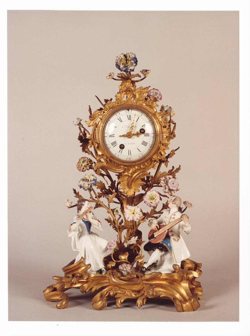 Orologio da tavolo con fiori e due figurine in porcellana di Meissen con montatura in bronzo dorato.