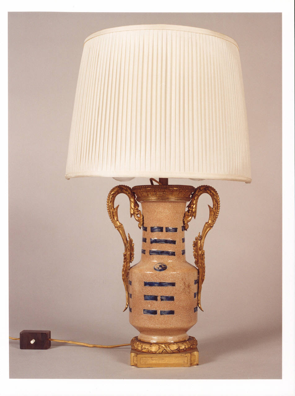 Vaso in porcellana cinese craquelé con montatura in bronzo dorato adattato a lampada; paralume in seta pieghettata.
