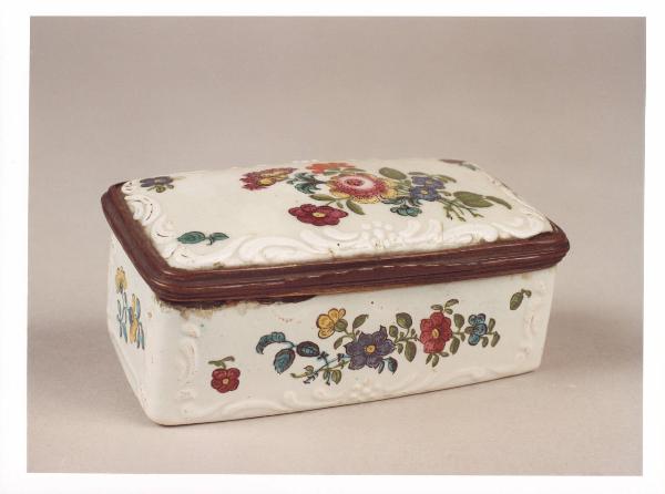 La tabacchiera, in porcellana dipinta e di forma rettangolare, ha un coperchio incernierato. Presenta sia una decorazione a rilievo sia una decorazione dipinta, che raffigura elementi floreali. Opera di una manifattura francese, è databile alla seconda metà del XVIII secolo.
