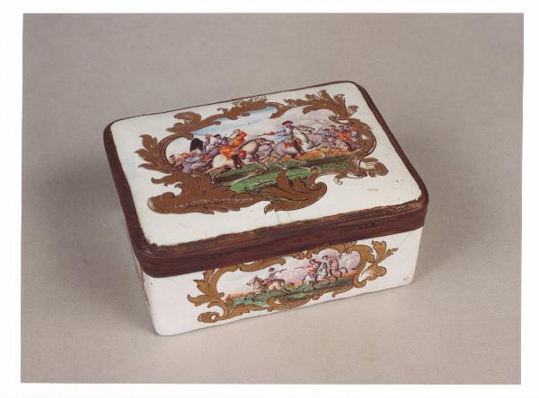 La tabacchiera, in porcellana dipinta e di forma rettangolare, ha un coperchio incernierato. Sulla superficie della scatola, in porcellana bianca, sono raffigurate scene di battaglia incorniciate da motivi decorativi fogliati e dorati. L'interno presenta invece un rivestimento in smalto blu con decori fogliati in oro. Opera di una manifattura francese, è databile all\na seconda metà del XVIII secolo.