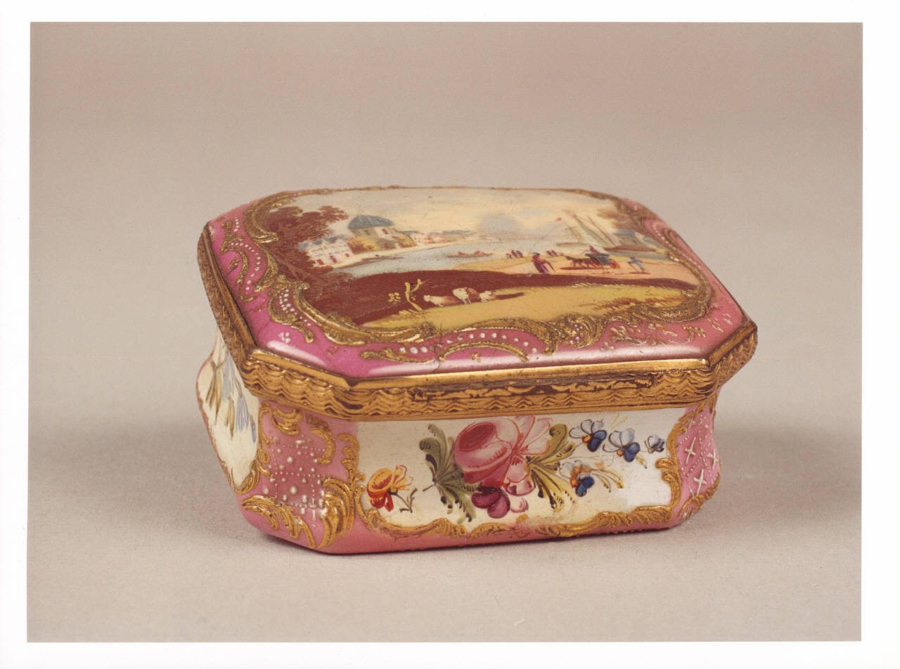 La tabacchiera, in porcellana dipinta, ha un coperchio a incastro. E' decorata con elementi floreali lungo i fianchi, un paesaggio lacustre sul coperchio. Opera di una manifattura francese, è databile alla seconda metà d\nel XVIII secolo.