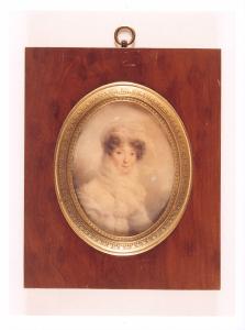 Acquerello su carta raffigurante una dama con velo, inserito in un ovale centrale in bronzo dorato ornato da palmette e racemi; cornice rettangolare esterna in radica. Miniatura di Jean-Baptiste Isabey (1767-1855), 1810-1815 circa; opera firmata.