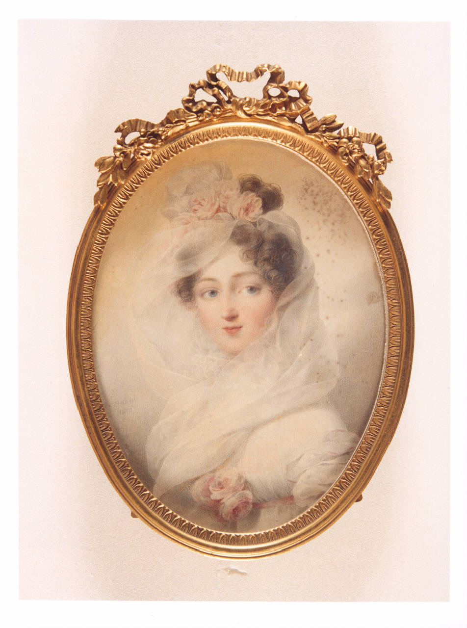 - NOTIZIE STORICO CRITICHE La miniatura è opera del pittore francese Jean-Baptiste Isabey (1767-1855\n). L'artista francese, sfruttando la moda del tempo di Luigi XVI, diventa noto per le sue miniature, realizzate per scatole, tabacchiere e bottoni per l'abbigliamento. La moda della corte si diffonde presto tra la borghesia, facendo aumentare la domanda di miniature e portando così Isabey a ela\nborare una modalità pittorica tanto veloce quanto personale: una tecnica \nrapida, meno attenta e precisa, ma che gli permette di trattare con naturalezza tanto l'incarnato quanto i tessuti degli abiti e i decori nei capelli. Dal 1810 utilizza una sorta di carta velina simile alla pergamena, ma più facile da tendere, che fissa su una lastra di metallo smaltata sul dav\nanti. Gli accordi cromatici resi possibili da questa tecnica sono in questo genere di opere la misura della loro bellezza. L'acquerello raffigura una giovane donna a mezzo busto, dall'incarnato roseo e dalla piccola bocca rossa a cuore. Indossa un abito bianco ornato da rose, che compaiono anche sull'acconciatura, da cui parte un raffinato velo che scende fino alla vita, dove è fermato da un nastro rosa. La donna raffigurata è la contessa\n Maria Leczynska Walewska (1786-1817), che ebbe, nel 1810, un figlio da Napoleone I, divenuto poi Ministro degli Esteri francese dal 1855-1860. L'opera, firmata e datata 1812, faceva parte della collezione dell'imprenditore milanese Alighiero de' Micheli (1904-1995), composta da più di 140 ogge\ntti e donata al FAI dopo la sua morte con legato testamentario. L'intera raccolta è stata collocata nella camera della Principessa di Villa Necchi \nCampiglio a Milano, con un allestimento di Filippo Perego che ha l'obiettivo di ricostruire il salotto del collezionista, dove originariamente erano custodite le opere. Facevano parte della collezione dipinti veneti (Rosalba Carriera e Canaletto), miniature di Jean-Baptiste Isabey, mobili e orologi francesi, specchiere veneziane, ceramiche milanesi, porcellane francesi e cinesi, tabacchiere francesi, inglesi e tedesche.