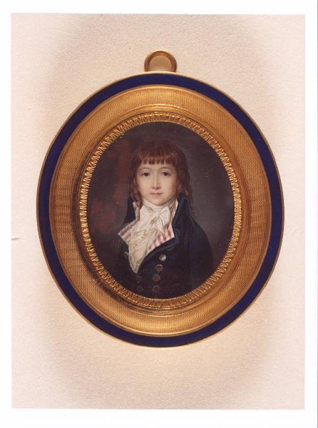 - NOTIZIE STORICO CRITICHE La miniatura raffigura un bambino di tre quarti con un elegante abito scuro, dotato di bottoni dorati; intorno al collo, una cravatta bianca chiusa da un fiocco. Il volto, dai vivaci occhi scuri, è incorniciato dai capell\ni castani. E' realizzata su avorio, materiale ampiamente usato nel Settecento per la sua capacità di valorizzare le trasparenze dell'acquerello, e \ndotata di una cornice il legno dorato e intagliato, con profilo in smalto azzurro. Inizialmente attribuita a Jean-Baptiste Isabey, è stata successi\nvamente ricondotta per il tipo di composizione più austera alla mano di J\nacques Augustin (1759-1832). Tuttavia, sulla miniatura pendant della presenta è riportata l'iscrizione "Villers", che permette di avvicinare l'oper\na (grazie anche a confronti con opere simili custodite presso la Fondazione Accorsi di Torino e il Metropolitan Art Museum di New York) a un certo "L. Villers", pittore che espose al Salon de Paris tra 1793 e 1804, oppure a Maximilien Villers, nato a Parigi intorno al 1760 e allievo di Jean-Baptiste Regnault (1754-1829). Il pendant è databile alla fine del Settecento\n. L'opera faceva parte della collezione dell'imprenditore milanese Alighiero de' Micheli (1904-1995), composta da più di 140 oggetti e donata al FA\nI dopo la sua morte con legato testamentario. L'intera raccolta è stata c\nollocata nella camera della Principessa di Villa Necchi Campiglio a Milano, con un allestimento di Filippo Perego che ha l'obiettivo di ricostruire il salotto del collezionista, dove originariamente erano custodite le opere. Facevano parte della collezione dipinti veneti (Rosalba Carriera e Canaletto), miniature di Jean-Baptiste Isabey, mobili e orologi francesi, specchiere veneziane, ceramiche milanesi, porcellane francesi e cinesi, tabacchiere francesi, inglesi e tedesche.